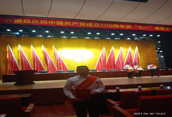 ?????? 6月30日上午,江西公司兴国工业污水处理厂负责人杨运锋同志在兴国县“七一表彰大会”上被兴国县委授予2020年度“兴国县优秀共产党员”荣誉称号。
