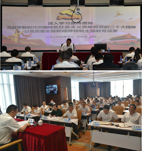 ? ? ? ?张维聚焦落实“学思想、强党性、重实践、建新功”总要求,以“深入学习宣传贯彻习近平新时代中国特色社会主义思想和党的二十大精神 以高质量发展新成效检验主题教育成果”为主题,结合学习江西公司改革发展党建工作实际,深入阐述了开展主题教育的重大意义、强调了开展主题教育的目标任务、突出要求以主题教育促进提升江西公司高质量发展能力水平,并重点从学习贯彻落实习近平总书记关于党的建设、生态文明思想、科技创新、国资国企、统筹发展和安全、调查研究等领域的重要论述,以及对标对表党章等七个方面入手,作了系统、全面地分析和讲解。 ? ? ? ?张维指出,这次主题教育关系到如何更好贯彻落实党的二十大精神,关系到如何更好推进中国式现代化这一新时代新征程党的中心任务,关系到如何更好保持解决大党独有难题的清醒和坚定。我们要深刻认识到开展主题教育的重大意义,统一思想,提高认识,着力在新征程上凝心铸魂创伟业,踔厉奋发建新功。 ? ? ? ?张维强调,“学思想”是基础,“强党性”是关键,“重实践”是谋事之基,“建新功”是落脚点,要牢牢把握主题教育的目标任务,强化理论武装,切实把学习成果转化为奋进新征程建功新时代的强大动力;要坚定理想信念,树牢宗旨意识,勇于自我革命,持之以恒推进全面从严治党;要在建新功上有新突破,坚持一张蓝图绘到底,续写江西公司新的“十年辉煌”。 ? ? ? ?张维要求,要更加深入学习领会习近平新时代中国特色社会主义思想的精髓要义、科学体系、实质要求,将党的创新理论融入到企业发展中,结合“能力提升年”工作部署,着力强化党建引领、国家战略支撑、科技创新、经营管理、风险防控、作风建设及党风廉政建设等方面的能力,推动江西公司实现更高质量发展成效。 ? ? ? ?公司中层及以上干部,本部全体党员、发展对象及入党积极分子在现场参加学习;各子公司领导班子成员以及其他下属单位党员、发展对象和入党积极分子在各自分会场以视频方式参加。